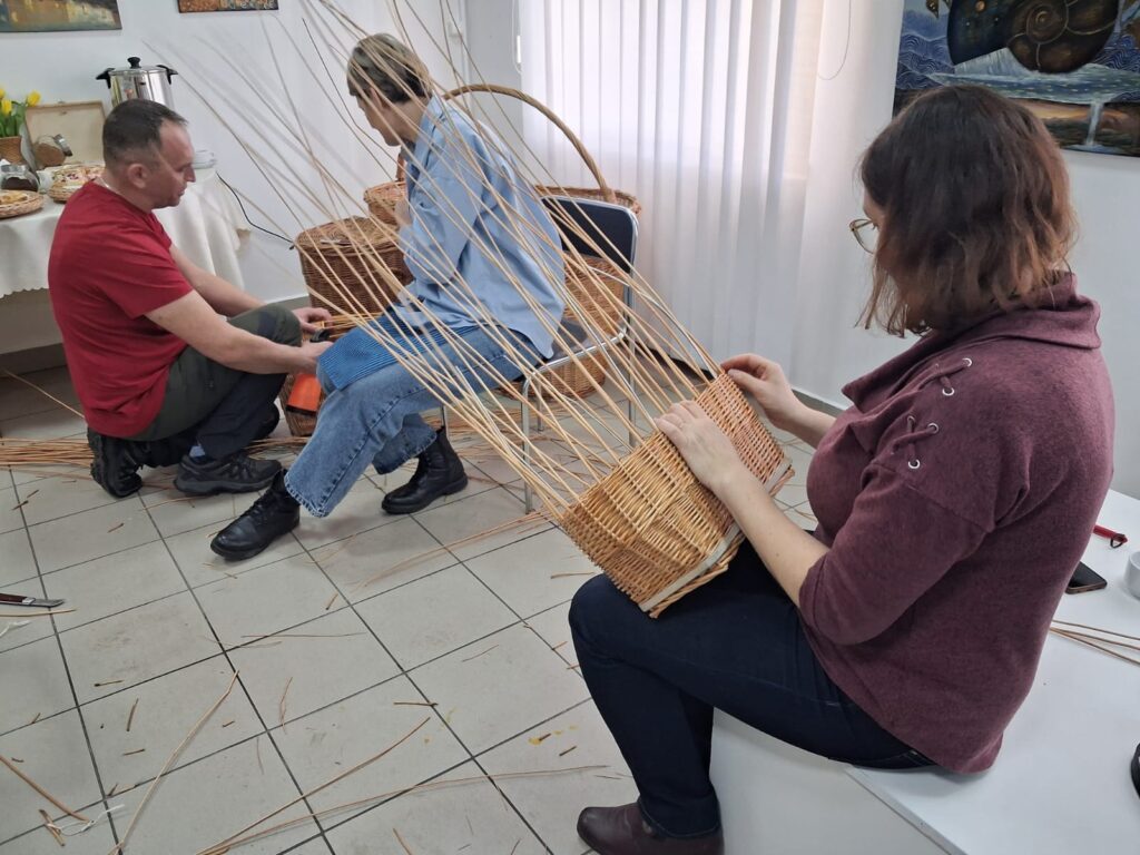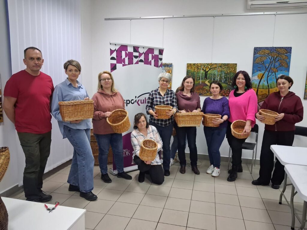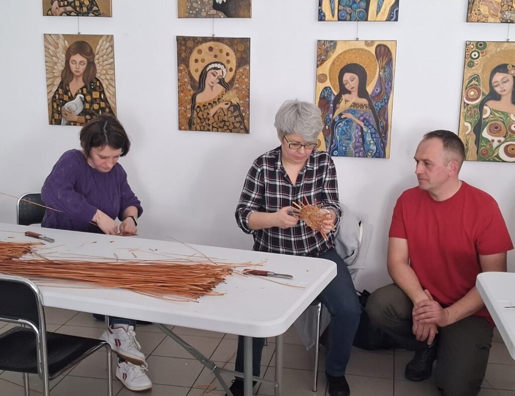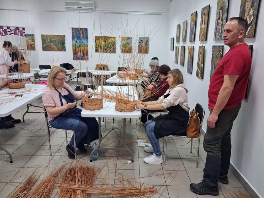 Drugą część dnia wypełniły warsztaty wikliniarskie prowadzone przez mistrza pana Marcina Jakubowskiego. Uczestniczki zapoznały się z podstawowymi splotami oraz technikami wyplatania. Pod okiem prowadzącego tworzyły własne wyroby z wikliny – tacki i torebki. Zajęcia były okazją do jeszcze lepszego zapoznania się z tradycyjnym rzemiosłem, z którego słynie nasz region.