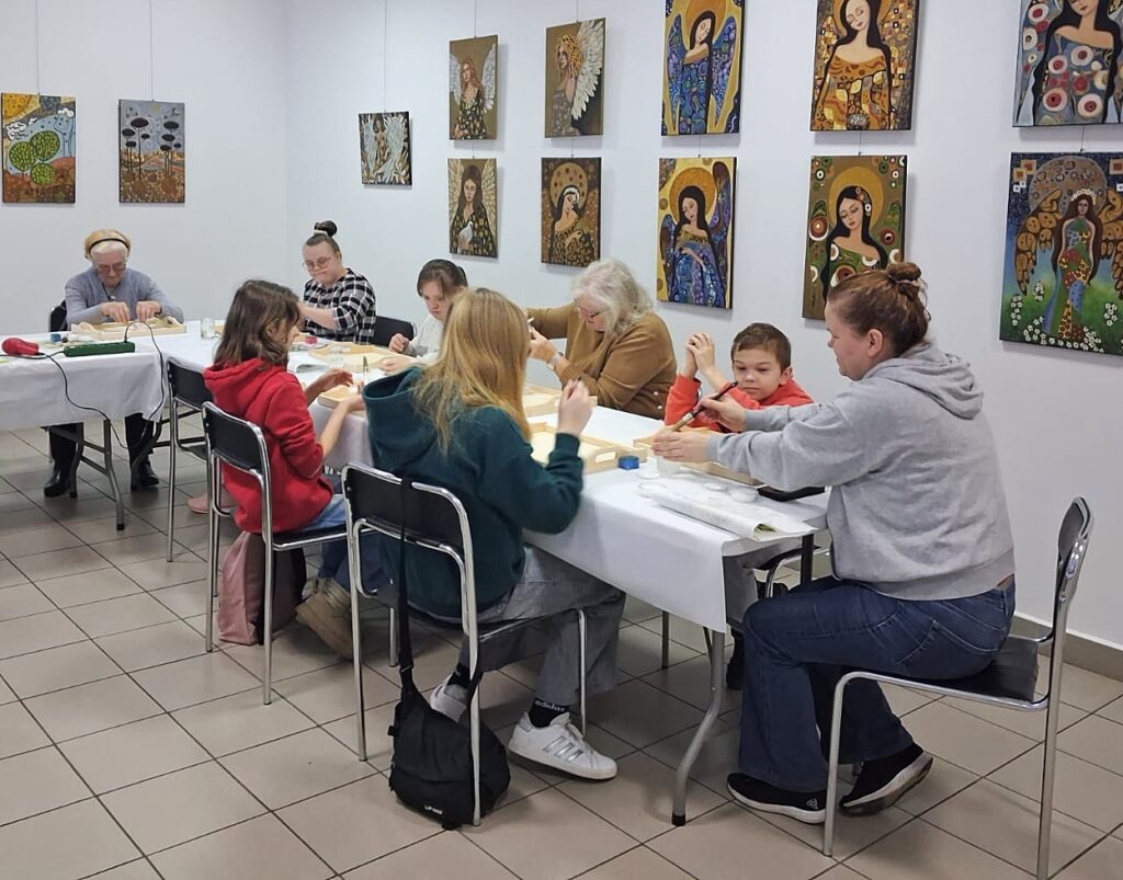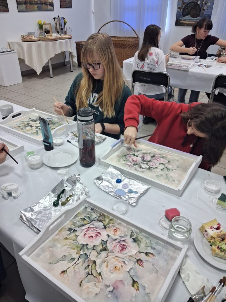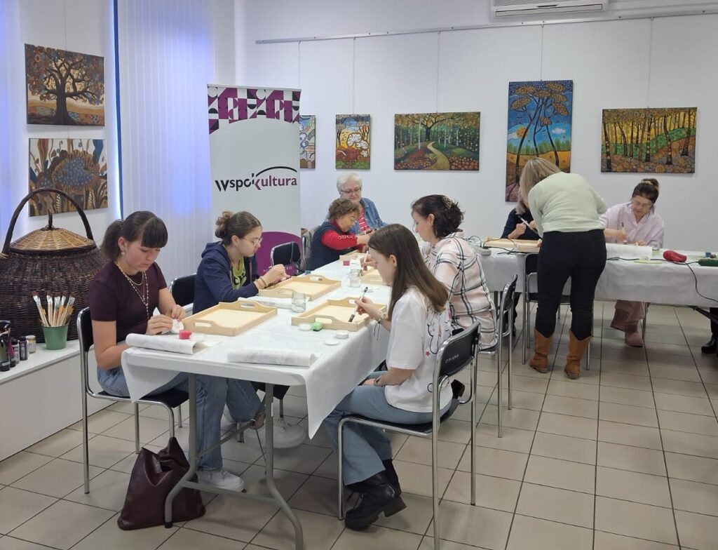 Dzień rozpoczął się warsztatami decoupage, które poprowadziła pani Anna Seroka-Szoja. Podczas zajęć uczestniczki poznały historię i podstawowe techniki zdobienia przedmiotów tą metodą. Każda z nich miała możliwość samodzielnie wykonać dekoracyjną tacę, tworząc autorską kompozycję z wykorzystaniem kolorowych serwetek, farb i lakierów.